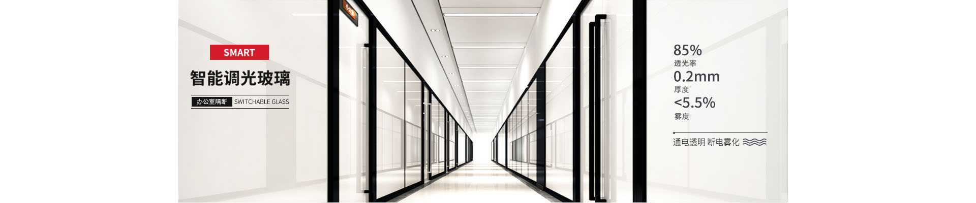 調光玻璃可作為寫字樓、酒店、機關單位、高檔住宅等場所的隔斷墻和門窗的應用。通電透明讓空間完全開放,斷電霧化營造私密空間,隨心控制空間開放狀態,提升空間舒適感。?