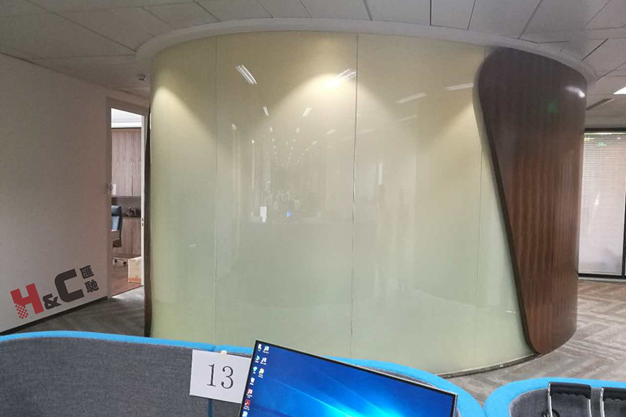 該辦公區(qū)域使用調(diào)光玻璃的地方很多,原來(lái)的一個(gè)大空間被分隔為幾個(gè)獨(dú)立的辦公室和會(huì)議室。平玻與彎玻相結(jié)合,弧形調(diào)光玻璃的圓角設(shè)計(jì)也與大樓的承重圓柱交相呼映,完美詮釋了高檔辦公室的內(nèi)涵。