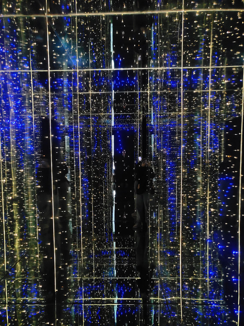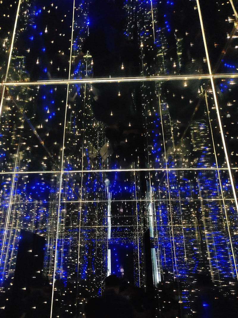 材質應用說明:LED鏡面玻璃為本作品的主材,利用鏡面之間的無限反射塑造N次方的疊加空間,同時利用LED點狀光源玻璃應用造出無盡星空宇宙,置身其中猶如隔世。